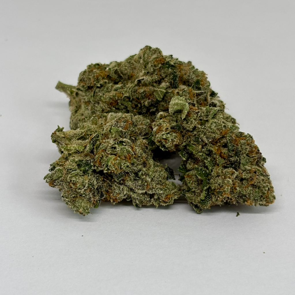 - Appearance: Dense, resin-coated buds with deep green tones and heavy trichome coverage